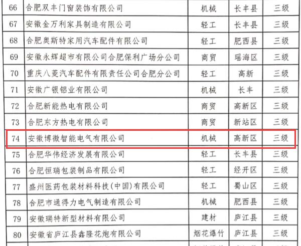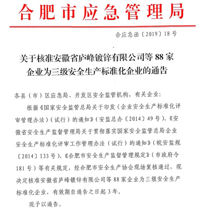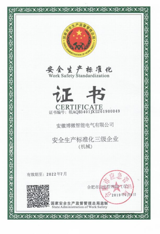 2019年7月11日,合肥市安全生產監(jiān)督管理局根據《國家安全監(jiān)管總局關于印發(fā)企業(yè)安全生產標準化評審管理辦法(試行)的通知》(安監(jiān)總辦〔2014〕49號)等有關規(guī)定,經合肥市安全生產協(xié)會現場復核合格,市安監(jiān)局決定核準安徽博微智能電氣有限公司等88家企業(yè)為三級安全生產標準化企業(yè)。