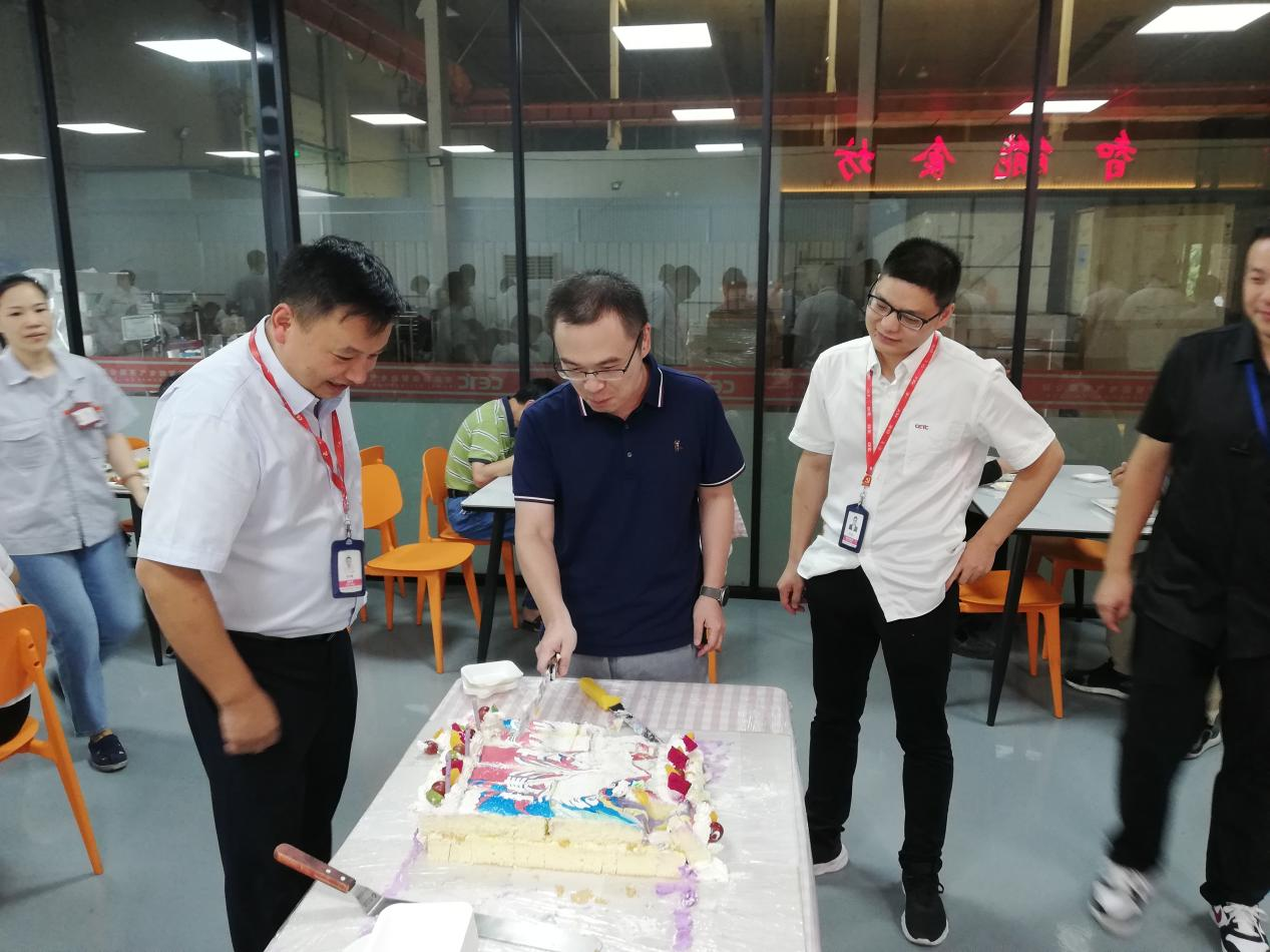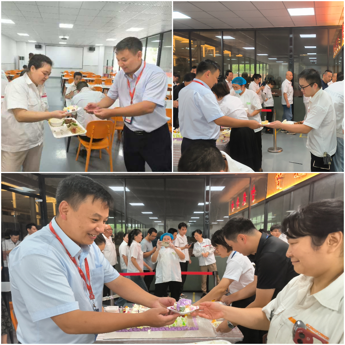 活動(dòng)伊始,公司領(lǐng)導(dǎo)在科研管理大樓和生產(chǎn)制造基地參加切蛋糕儀式,為員工分切糕點(diǎn)。