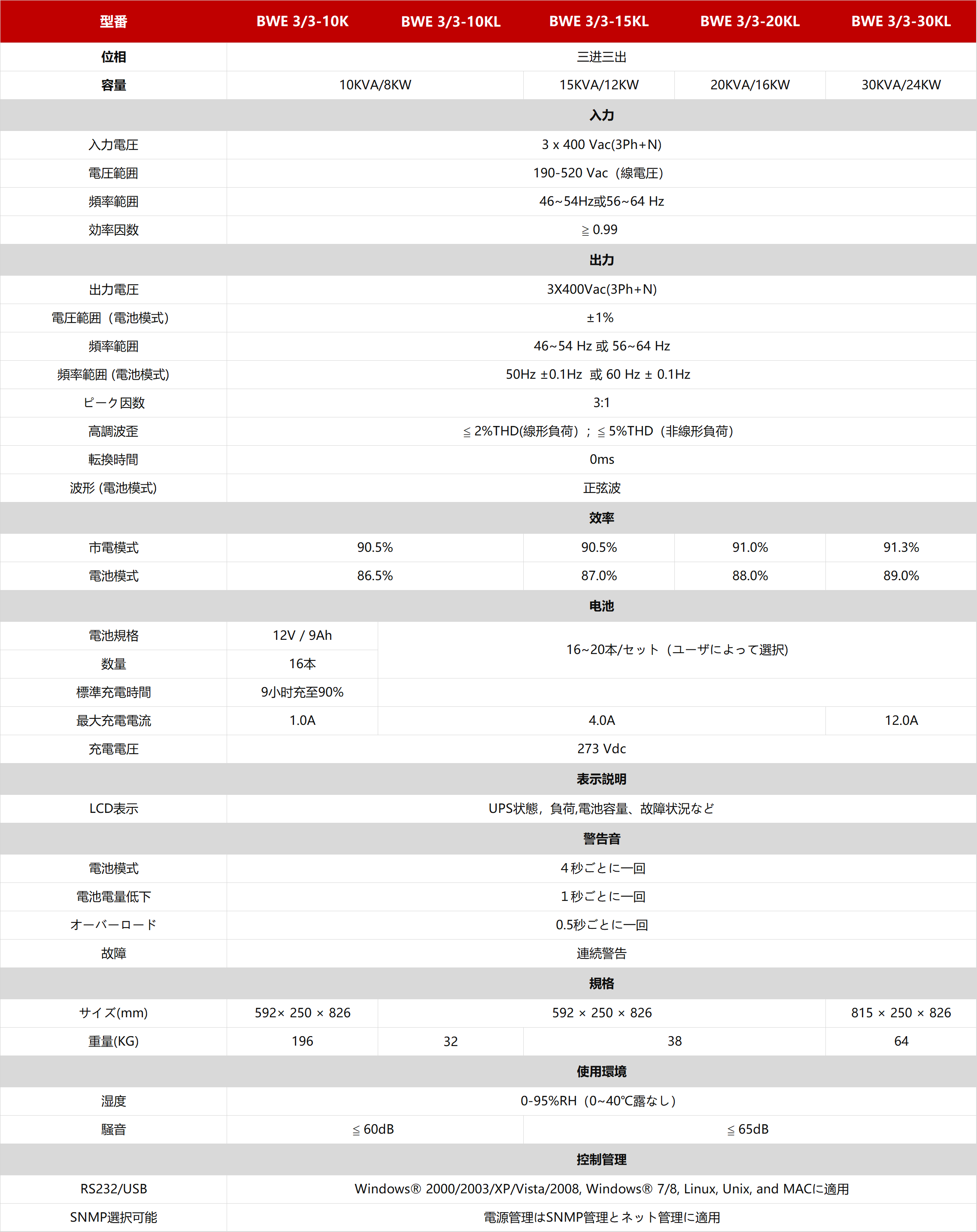 整流と逆変の機能のある高周波オンライン式UPS電源システム。 BWE系列は中電博微整流逆変技術の成果です。デジカル化のDSPコントロール技術によって最大限度でハードウェアを保護し、埋め込み式ソフトウェアを核心とする高密度UPS電源になります。 三つの相位入力、一つ相位の出力と一つ相位の入力、一つ相位の出力などの配電方式があり、最大限度で6臺が並列できます。効率範囲は1-30KVAです。だから、ご客の多様化の要求に満足できます。この系列は交通、ファイナンシャル、政府などの領域に適用できます。