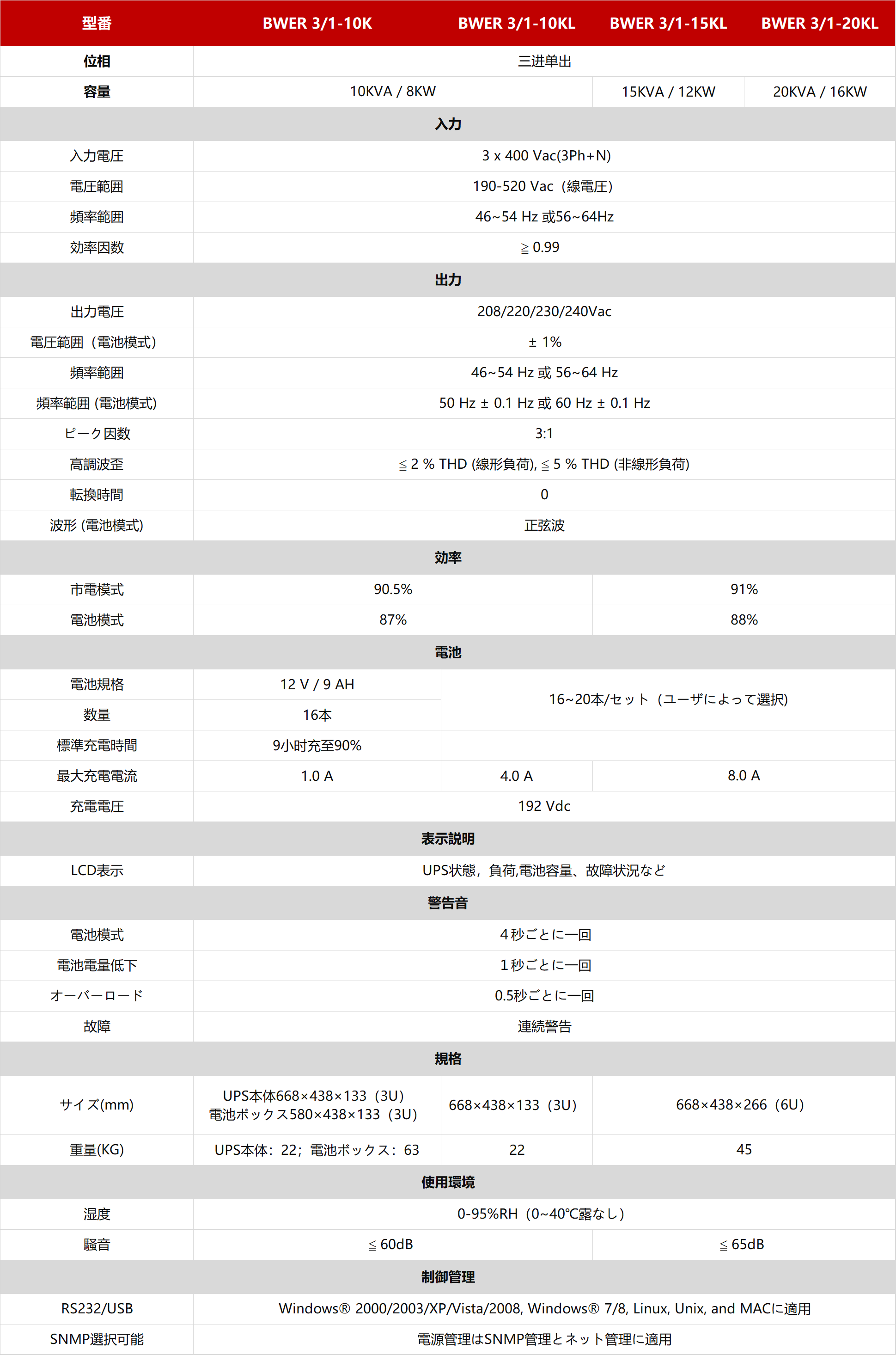 BWER系列(引き出し式) BWER系列(3/1-10-20K)は、中電博微が高周波UPS電源の先端製品であり、負(fù)荷に最適な電源環(huán)境を提供することができます。出力電圧範(fàn)囲、周波數(shù)範(fàn)囲、入力雑報(bào)のフィルタ、及び市電模式と電池模式のゼロ変換時(shí)間などから考え、BWER系列は最高のUPS構(gòu)造です。だから、通信システム、ITインテーネットシステムあるいは電気環(huán)境に要求の高い設(shè)備のような肝心な設(shè)備に、安定性の高い電源を提供できます