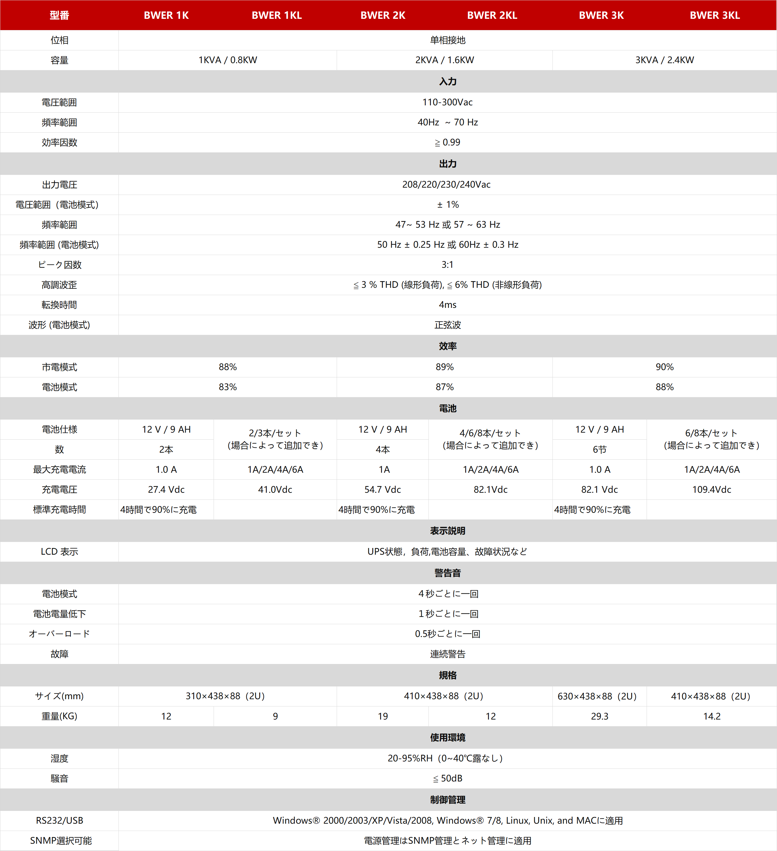 BWER系列(引き出し式) BWER系列(1-3 KVA)は、中電博微が高周波UPS電源の先端製品であり、負(fù)荷に最適な電源環(huán)境を提供することができます。出力電圧範(fàn)囲、周波數(shù)範(fàn)囲、入力雑報(bào)のフィルタ、及び市電模式と電池模式のゼロ変換時(shí)間などから考え、BWER系列は最高のUPS構(gòu)造です。 だから、通信システム、ITインテーネットシステムあるいは電気環(huán)境に要求の高い設(shè)備のような肝心な設(shè)備に、安定性の高い電源を提供できます